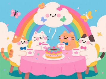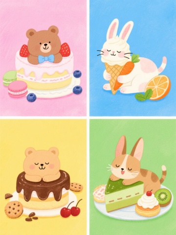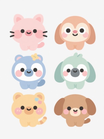 cute cartoon illustration style, soft watercolor texture, light background, four different breeds of kittens in different poses arranged in two rows, each kitten with big round eyes and pink cheeks, wearing cute costumes, first row: a gray tabby cat in blue dinosaur costume holding a bouquet of roses, a white Persian cat in pink princess dress with a bow on head, second row: an orange American Shorthair in yellow astronaut suit waving, a black British Shorthair in green witch hat and cape holding a magic wand, cohesive soft color palette, smooth lines, charming expressions, 2D flat illustration, clean composition, each kitten with distinct breed characteristics, uniform art style, adorable and lively atmosphere.