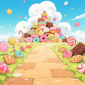 甜美卡通插画风,轻拟物波普艺术,糖果堆成山,梦幻童话世界。