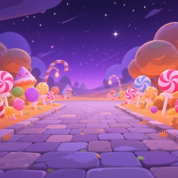 卡通游戏场景,前方是宽阔的石路地面,后方围绕着少量糖果,背景是夜晚星空,整体色调以紫色和橙色为主,场景视角开阔,细节丰富,风格大气,避免动漫感和过度实体化,整洁清爽