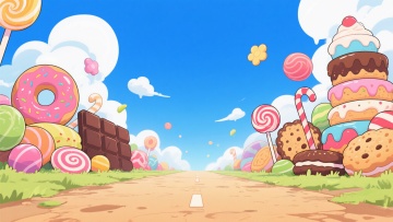 甜美卡通插画风,轻拟物波普艺术,糖果世界梦幻场景。