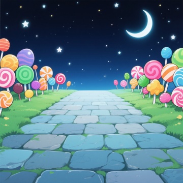 梦幻插画风,卡通感十足,虚拟现实中的糖果小径,引领至星空下的奇幻世界。