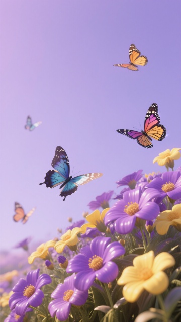 紫色和黄色的花生长在图片底部边角,蝴蝶在飞,插画风格,淡紫色背景,
