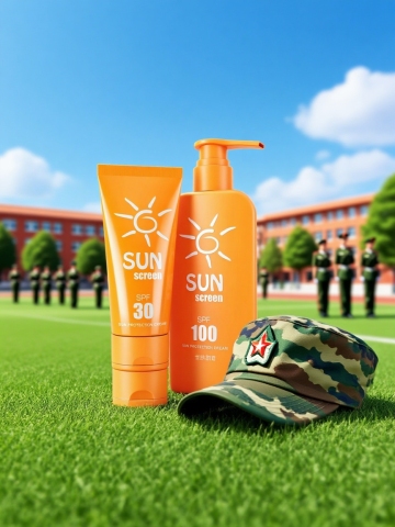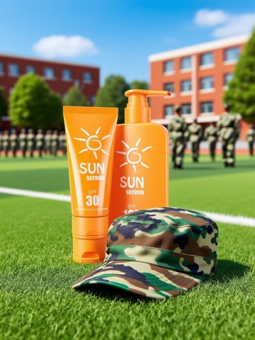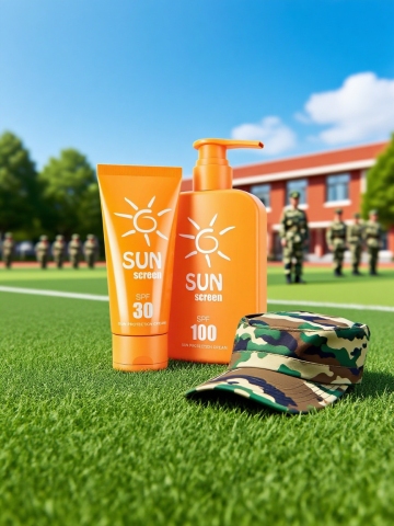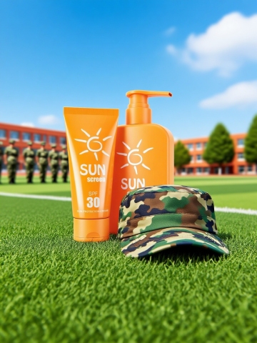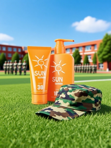 清爽现代扁平风设计,轻拟物实景感,橙色防晒霜与迷彩帽,校园军训氛围。