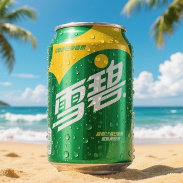 雪碧罐装饮料特写,绿色与黄色渐变的经典包装,表面有水珠质感,银色拉环和罐底,包装上有白色“雪碧”字样及“清爽柠檬味汽水”“透心凉 渴释放”文字,保持产品原比例和设计细节,背景替换为夏日阳光照耀下的冰镇饮料展示台,台面上散落着新鲜柠檬片和冰块,周围有虚化的绿色树叶和气泡升腾的清凉氛围,整体风格保持写实产品摄影质感,光线明亮柔和,突出饮料的冰爽清新感。