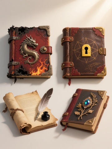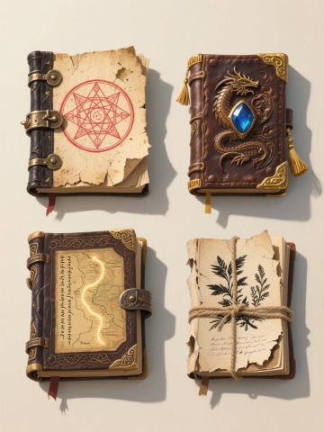 4个不同类型、不同样式的魔法书元素,上下两行对齐排列,浅色背景。每本魔法书都具有高度写实的3D质感,厚重的古旧皮质封面,磨损的书页边缘,泛黄的纸张带有细致的纹理和轻微的污渍。第一行左侧是一本封面带有金属扣环和宝石装饰的厚重魔法书,右侧是一本封面上有神秘符文和羽毛笔插画的打开式魔法书;第二行左侧是一本边角卷起、书页间露出干枯植物标本的魔法书,右侧是一本封面有龙形浮雕、锁链缠绕的古老魔法书。所有魔法书都展现出古朴、神秘、充满历史感的氛围,光影效果自然,高光和阴影细节丰富,整体风格统一且细节精致。