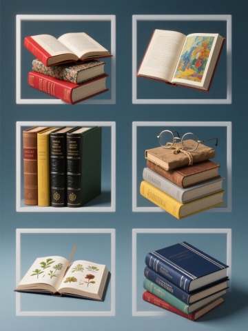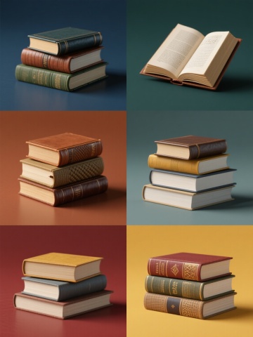 一张设计精美的书籍主题系列海报,高分辨率3D渲染,超写实材质表现与细腻光影效果,柔和漫射光源从左上方照射,书籍边缘形成清晰高光与自然阴影过渡,整体画面干净通透。纯色背景(如深蓝/墨绿/赭石/明黄/浅灰/酒红),中央区域网格布局整齐排列6个带白色边框的书籍组合元素:1. 红色书脊打开硬壳精装词典叠放三本不同花纹封面平装书,内页文字清晰;2. 五本黑色皮质封面烫金书名经典文学著作竖排堆叠,最上方斜放翻开笔记;3. 三本印象派画作局部封面艺术画册,一本翻开展示色彩丰富油画作品;4. 麻绳捆绑复古牛皮纸封面书籍,顶部放置金属圆框眼镜;5. 四本不同语言版本同主题彩色软质封面书籍呈阶梯状排列,最上层打开露出书签;6. 深蓝色封面配银色线条装饰硬壳精装科学图鉴叠放打开的植物标本集。所有元素保持统一3D写实风格与相似光影处理,元素间距均匀,视觉层级清晰,信息传达高效,具知识文化类宣传品设计感。