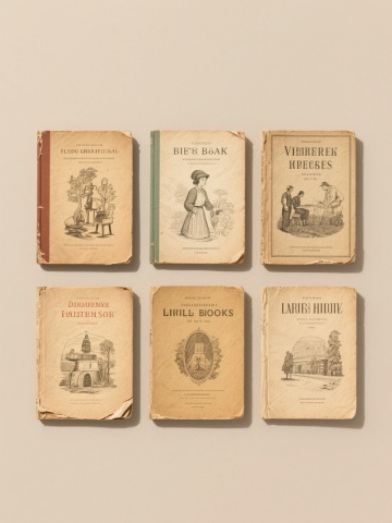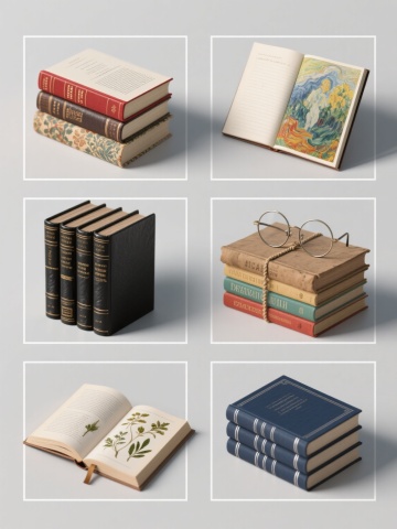 一张设计精美的书籍主题系列海报,高分辨率3D渲染,超写实材质表现,细腻光影效果,柔和漫射光源从左上方照射,书籍边缘有清晰高光和自然阴影过渡,整体画面干净通透。浅灰色纯色背景,中央区域网格布局整齐排列6个带白色边框的书籍组合元素,间距均匀:1. 一本打开的红色书脊硬壳精装词典,内页文字清晰,叠放在三本不同花纹封面的平装书上;2. 一套五本竖排堆叠的黑色皮质封面经典文学著作,烫金书名,最上方斜放一本翻开的笔记;3. 三本不同尺寸的艺术画册,封面为印象派画作局部,其中一本翻开展示色彩丰富的油画作品;4. 一摞复古牛皮纸封面书籍,用麻绳捆绑,顶部放置一副金属圆框眼镜;5. 四本不同语言版本的同主题彩色软质封面书籍,呈阶梯状排列,最上层打开露出书签;6. 一套深蓝色封面配银色线条装饰的硬壳精装科学图鉴,叠放一本打开的植物标本集。所有书籍元素保持统一3D写实风格和相似光影处理,视觉层级清晰,信息传达高效,符合知识文化类宣传品设计感。