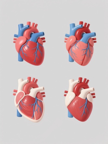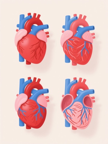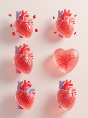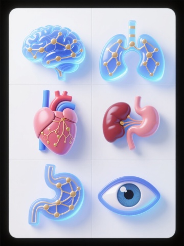 一套6个不同人体器官的医学插画系列素材集合,保持统一的卡通风格,采用平滑的线条、渐变的肉色和红色调,每个器官都有清晰的解剖结构细节,器官表面有柔和的高光和阴影表现立体感,所有器官规整地排布在纯白色背景上,整体呈现出简洁、专业且易于理解的医学图解风格,器官包括心脏、肺脏、肝脏、肾脏、胃和大脑。