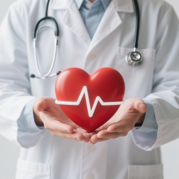一位穿着白色医生服的医生,胸前挂着听诊器,双手掌心向上捧着一颗鲜红的、带有白色心电图线条的立体心形图案,光线柔和明亮,画面简洁纯净,突出医生与心脏元素,营造出专业、关怀的医疗氛围。