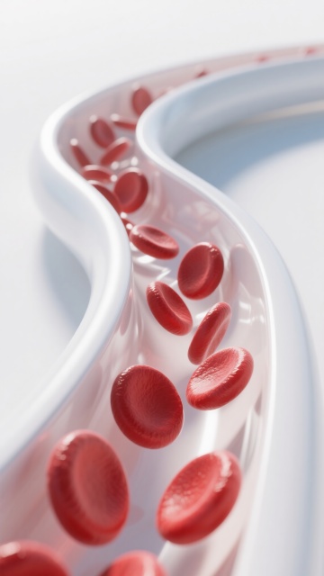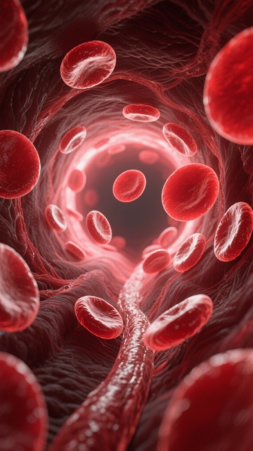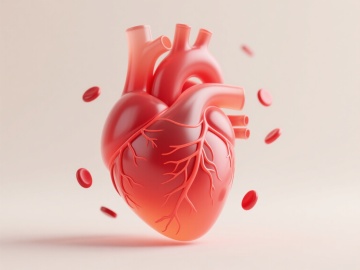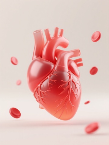 3D重拟物风格的心脏,强体积感与科技光影交织,塑料质感柔和呈现,虚拟现实氛围中漂浮红细胞,传递生命律动之美。