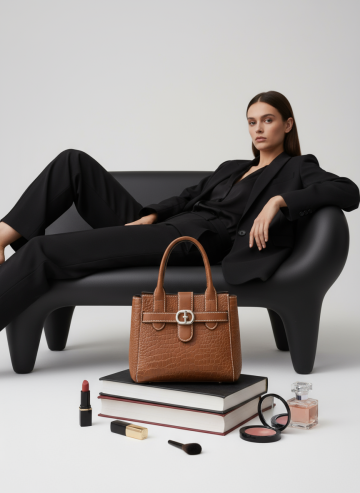 简约现代风格,棕色背包置于柔软沙发之上,营造舒适温馨氛围。