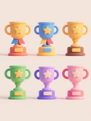 6个不同配色、不同样式、不同材质的3D卡通风格奖杯,采用圆润的造型设计,每个奖杯都有独特的装饰元素,如星星、条纹、花纹等,色彩鲜明且和谐,奖杯表面有光滑的塑料质感、磨砂金属质感、光泽釉面质感等多种材质表现,整体排列为上下两行各3个对齐分布,置于浅色背景上,光影柔和,高光与阴影过渡自然,具有简洁明快的视觉效果。