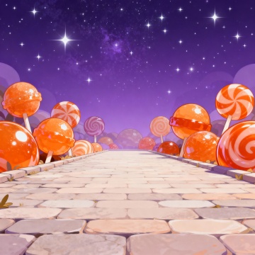 梦幻插画风,卡通感十足,虚拟现实中的糖果小径,引领至星空下的奇幻世界。