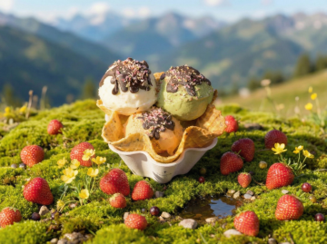 梦幻蓝冰激凌悬浮于极地冰川,3D超现实风格,玻璃质感与清爽冷调交织,虚拟现实中的清凉奇境。
