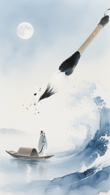 古典中式水墨风,超现实主义梦幻感,月下舟行,笔墨生波。