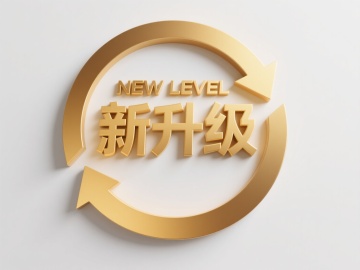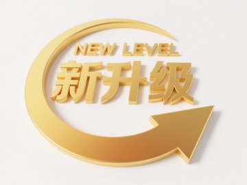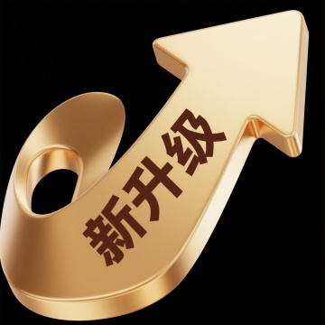 一个白色背景上的3D立体设计,金色金属质感的向上弯曲箭头图标,箭头表面有细腻的高光和阴影表现,呈现出光滑的金属光泽,箭头中央位置有“新升级”三个汉字,字体为粗体无衬线风格,颜色为深棕色,文字与金色箭头形成鲜明对比,整体设计简洁现代,具有清晰的视觉层级,突出“新升级”的核心信息,传达出积极向上、品质提升的氛围。
