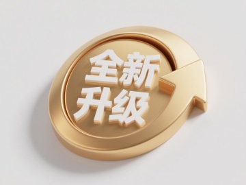 一个具有强烈3D金属质感的圆形徽章图标,徽章主体为纯净的白色,边缘有精致的金色描边和高光处理,呈现出光滑细腻的材质感。徽章顶部中央有“NEW”字样,采用金色衬线字体,两侧各有一颗小巧的金色五角星装饰。徽章中心位置是大号的金色汉字“全新升级”,字体为稳重的宋体,笔画饱满,边缘有轻微的立体浮雕效果。徽章右下角有一个向外翻折的金色箭头形角标,与圆形主体自然过渡,形成动感。整体光影效果柔和,光源来自左上方,在徽章表面形成自然的明暗过渡和细腻的反光,白色背景纯净简洁,使徽章主体更加突出,整体设计传达出简洁、高端、正式的视觉感受。