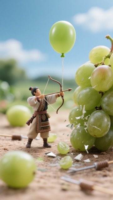 清新卡通风,微缩艺术展现射箭少女与葡萄的趣味互动,创意十足。