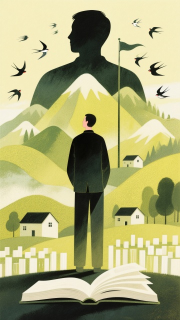 清新插画风,双重曝光融入超现实主义,水彩质感展现书中山水与飞翔的鸟儿。