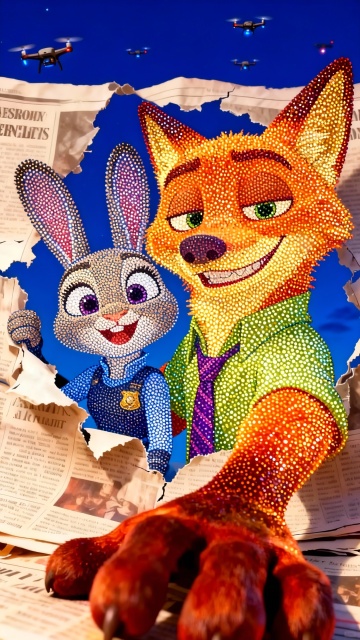 卡通感十足的3D拟人动物警官,撕纸风拼贴背景,融合城市街景与报纸碎片,营造出趣味十足的节日氛围。