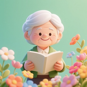 软3D风卡通奶奶阅读,温馨可爱,花丛环绕,节日氛围浓厚。
