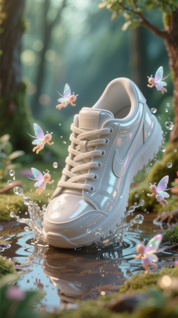 森林,一只运动鞋特写,踩在一个水坑,踩起水花肆溅,一群小精灵在周围嬉戏打闹