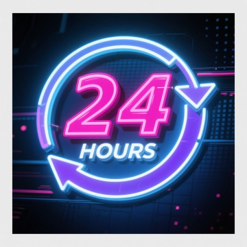 一个具有未来科技感和动态效果的24小时服务标志设计,采用霓虹灯风格,主要元素为一个圆形箭头环绕着数字“24”和英文单词“HOURS”。圆形箭头呈现出流畅的弧度,内部填充明亮的蓝紫色渐变,边缘有发光的白色描边效果,箭头末端带有速度感的拖影。数字“24”采用粗体无衬线字体,填充鲜艳的粉红色,表面有细腻的金属光泽质感,字母“HOURS”为较小字号的白色无衬线字体,位于数字下方。标志背景为深色渐变,从中心的深黑色向外过渡到深蓝色,带有轻微的网格纹理和点状光效,整体营造出夜间霓虹灯招牌的视觉效果,既有科技感又能清晰传达24小时服务的核心信息。