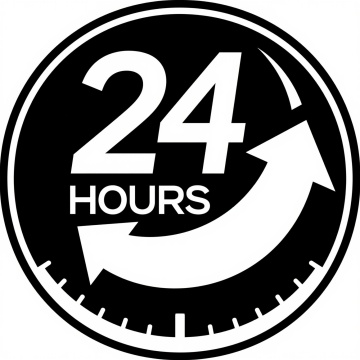 24 HOURS文字与顺时针箭头构成的圆形标志,采用扁平风格设计,黑色线条简洁流畅,白色背景纯净,箭头与环形跑道元素体现时间循环与持续服务,整体造型简约现代,信息传达清晰直观,符合24小时服务的品牌标识特征。