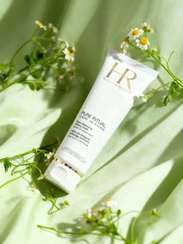 产品为主体,摆放白色石块做层次,把产品放在石块上,周围摆放白花,点缀绿色植物。