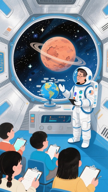 教室在宇宙飞船里,学生和老师穿着宇航服。外面是星海