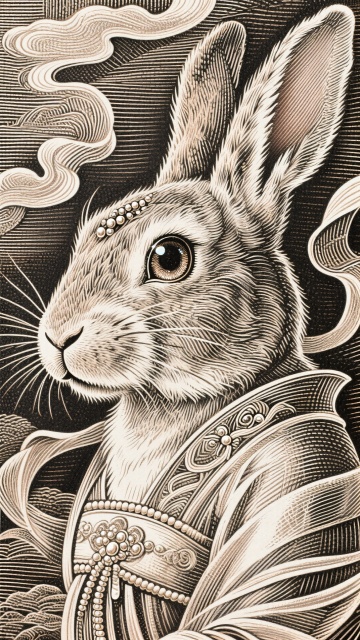 工笔风与刺绣风融合,古典中式仕女怀抱玉兔,手持月饼,云纹环绕,浮雕质感十足,国潮美学演绎中秋梦幻唯美意境。