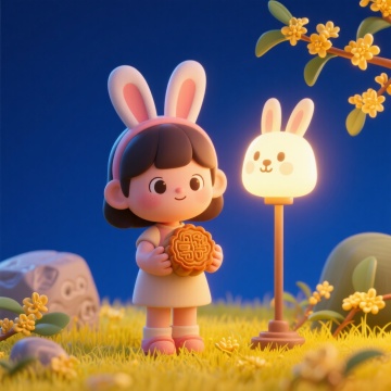 粉色小兔造型儿童书包放在秋日草坪上,书包有反光条和可拆卸耳饰,旁边有半透明卡通兔精灵手捧小花微笑看向书包,背景是金黄银杏树与柔和光晕,梦幻氛围,突出安全与可爱