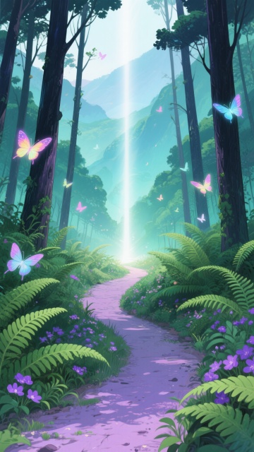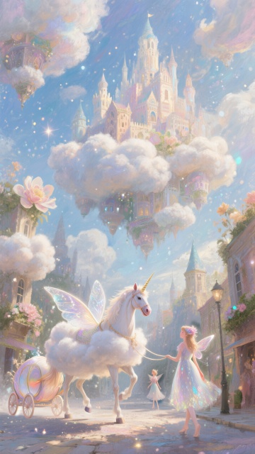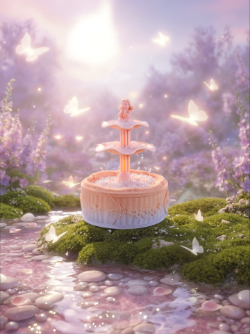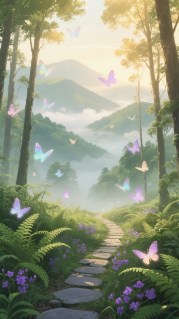 一只带翅膀造型的儿童书包(浅紫色蝴蝶图案)放在秋日花园石阶上,书包轻盈漂浮离地几厘米,旁边环绕三个发光的小精灵,手持丝带围绕书包旋转,背景是盛开的秋菊与暖阳,童话感十足,象征梦想启航,3:4竖版,梦幻光效