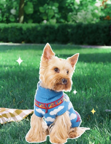 一只戴着金黄色烤吐司切片做成的猫脸面具的小狗,吐司面具边缘略呈焦黄色,表面有细密的烤痕纹理,中间剪出两个圆溜溜的黑色猫眼睛轮廓和一个小巧的粉色三角形猫鼻子,面具两侧有三角形的猫耳朵形状,小狗脖子上系着一条蓝色的领巾,领巾正中间有一个煎蛋造型的装饰,蛋黄呈橙黄色,蛋白为白色,小狗有着蓬松的白色和浅棕色相间的毛发,背景是灰色的沙发和浅色的墙壁,整体画面呈现出温馨、可爱、略带幽默的氛围,光线明亮柔和,对焦清晰,细节丰富。