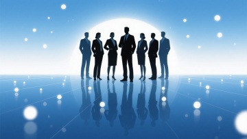 一群身着商务正装的团队成员剪影,位于画面中央,姿态挺拔,呈现出协作与领导的氛围。背景为渐变的蓝色调,从中心向四周逐渐过渡为明亮的白色光晕,营造出专业、现代且充满希望的感觉。地面有光滑的镜面反射效果,映照出人物的轮廓,增强空间感。画面中点缀着大小不一、分布均匀的白色光斑,如同散落的光点,增添科技感与未来感。整体风格为简洁的商务插画,线条流畅,色彩柔和,光影过渡自然,适合作为团队背景使用。