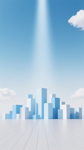 3D渲染风格,极简主义设计,柔和渐变的浅蓝色背景,明亮均匀的顶部光源,清晰柔和的阴影效果,白色光滑材质的展台,展台形状改为由两个大小不一的立方体错位堆叠而成,底层立方体较大,上层较小且略微偏移,整体呈现简洁现代的几何美感,表面光滑无纹理,空间感通透,视觉层次分明,营造宁静纯粹的氛围。