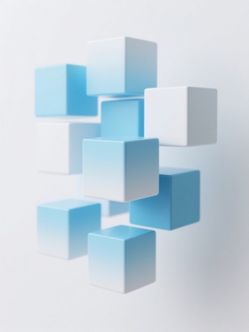 极简主义风格的3D几何装饰图案,由多个大小不一的浅蓝色和白色渐变立方体组成,立方体表面光滑,带有柔和的光影效果,呈现出轻微的悬浮感,整体构图简洁干净,色彩和谐统一,具有现代设计感,适合作为装饰元素使用,背景为纯白色,无文字和其他多余元素。