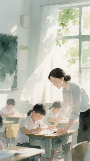 水彩风插画,清新柔和的教室场景,老师温柔指导学生,营造舒适温馨的学习氛围。