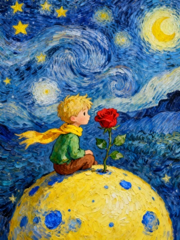 画面中心是一轮巨大的发光的月亮,弯弯的月亮,不是满月,月亮的下沿上坐着一个英国绅士,他的大小只有月亮的五分之一,向左上方望去,他头发凌乱,身穿邋遢的衬衫,手里握着一只油画画笔,深蓝色背景,灵感来自于名著《月亮与六便士》