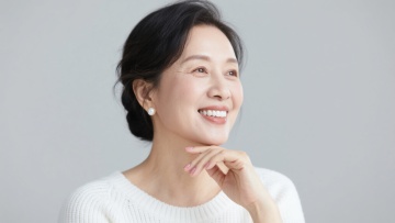 一位30岁左右的女性,保持着自然灿烂的微笑,眼神明亮有神,棕色的长发在脑后松松挽起,几缕碎发自然垂落在额前和脸颊两侧。她穿着一件质地柔软的白色针织衫,右手轻轻托着下巴,姿态优雅放松。整体画面采用高清人像摄影风格,光线柔和均匀,以浅灰色为背景,突出人物细腻的肌肤质感和自然的妆容,色彩清新淡雅,氛围温暖亲切,构图为经典的近景人像,聚焦于人物的面部表情和上半身姿态。