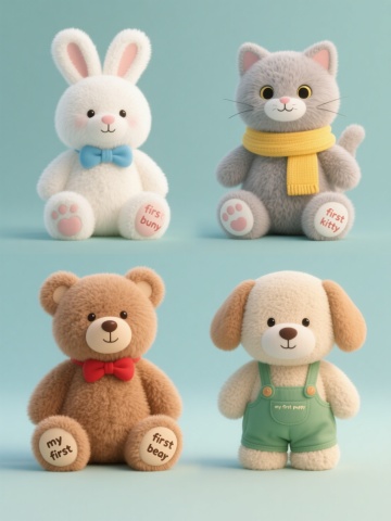 3D渲染风格的可爱动物角色设计,采用圆润饱满的造型,光滑细腻的塑胶质感表面,柔和均匀的漫反射光源,高光柔和不刺眼,阴影浅淡自然。四个不同类型的可爱动物,分别为坐姿托腮的小猴子、站立挥手的小兔子、趴着歪头的小熊和抱膝蹲坐的小狐狸,每个动物都有超大圆眼睛、粉嫩腮红和肉垫细节,色彩明快柔和。整体呈上下两行对齐排列,浅色纯净背景,构图均衡,充满童趣和治愈感。