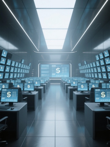 赛博朋克风格的现代化工厂内部场景,未来感十足的高科技生产线,金属质感的银白色精密设备与霓虹蓝色、紫色管线交织,昏暗空间中多色全息投影显示生产数据,工人身着带有发光线条的深色工装在机械臂间操作,地面反射着设备冷光形成镜面效果,天花板悬挂的工业吊灯投射出强烈光束切割黑暗,整体呈现出高科技、冷峻、略带神秘的工业氛围,画面构图采用纵深视角展现工厂的宏大与繁忙,细节丰富的机械结构与未来科技元素完美融合。