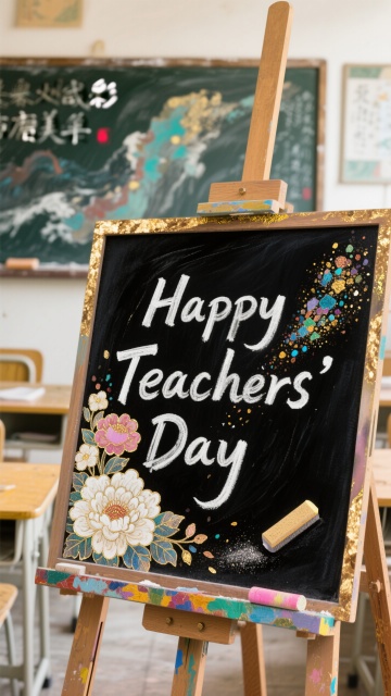 视觉中心是一面质感真实的黑色黑板,上面用优雅的白色粉笔字写着“Happy Teachers' Day”,但字母的笔画末端飘散开来,化作彩色的粉笔灰,这些粉笔灰在空中神奇地汇聚成绽放的花朵。黑板擦边缘干净,露出一点彩色痕迹。背景是虚化的教室场景。字体设计结合了粉笔的手写感和艺术的飘逸感。
