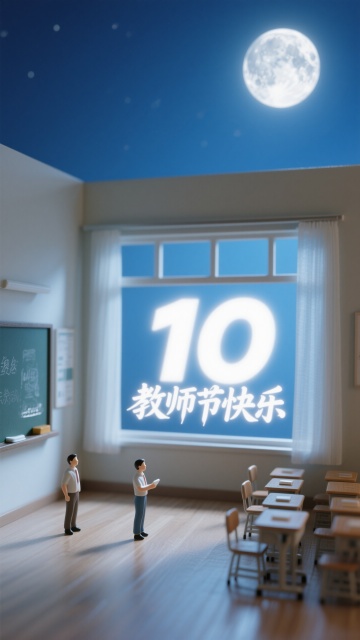 梦幻3D微缩教室,清新超现实主义风格,满月映衬教师节温馨祝福。
