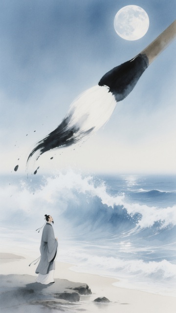 夜晚,一轮皎洁的明月高悬在深蓝色的夜空中,月光如水般洒在古朴的窗台上,一位身着白色长袍的诗人凭栏远眺,眼神中充满对故乡的思念,背景是朦胧的远山和淡淡的云雾,整体画面空灵静谧,充满仙气