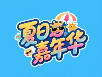 字体"夏日嘉年华",创意字体设计增加遮阳伞、太阳、墨镜等夏日小元素元素,涂鸦风格,蓝色背景。