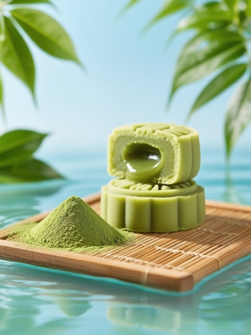 东方美学,两块冰皮月饼(表面有一层冰)放在深灰粗岩上,四周弥漫着浓郁的低悬干冰烟雾,桂花枝装饰画面。深灰粗岩置清透幽蓝冰面,光影交错,寒意冰爽清新氛围。