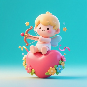 软3D风卡通小天使,梦幻可爱,超现实主义设计,情人节主题。