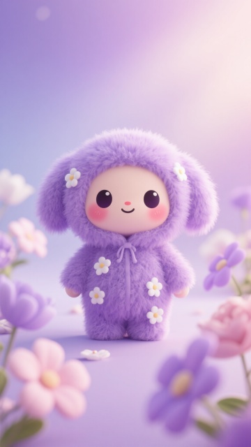 梦幻紫色渐变背景,柔和的浅紫到淡紫过渡,带有细腻的朦胧光晕效果,营造出温馨治愈的氛围。前景是穿着紫色毛绒连体装的可爱卡通角色,服装具有蓬松柔软的质感,点缀着白色小花装饰,角色表情呆萌,眼睛大而圆,脸颊泛着红晕。周围环绕着淡紫色和粉色的花朵,花瓣层次分明,背景虚化处理,突出主体。整体风格为3D渲染的卡通玩偶风格,光影柔和,色彩和谐统一,充满童趣和梦幻感。