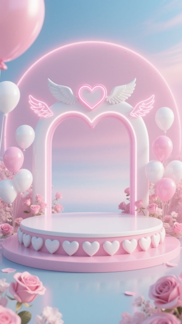 梦幻软3D风,霓虹灯心形拱门,甜美浪漫,点缀气球与玫瑰,情人节主题设计。
